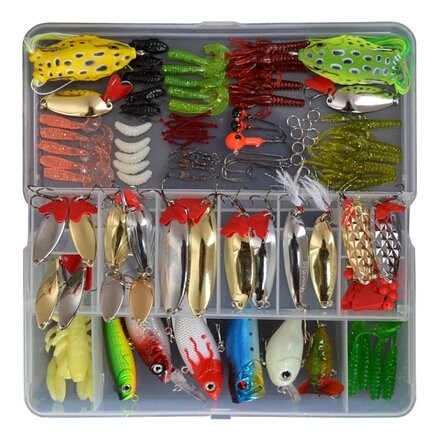 - 129 pcs in a plastic fishing tackle box include frog minnow popper rattlin sequins lures soft grub shrimp bait with sharp fishing hooks.