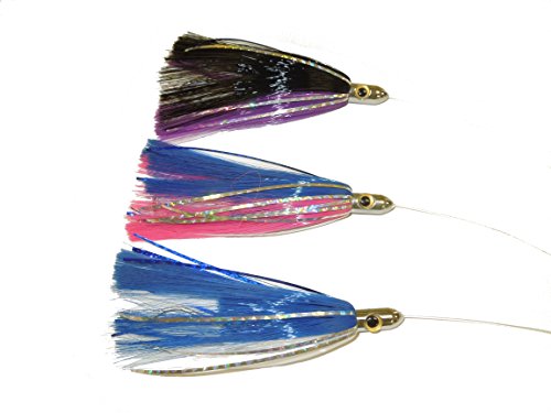 Length 6.5 inches Product Features 3 Chrome Ilander style bullet head high speed trolling lures. great action Realistic eyes High quality Rigged Product Description Everyone recognizes these lures and for good reason, they work! These 3 lures feature a chrome bullet head for high speed trolling and are in our most popular colors. The first Ilander style lure has a blue and white hair skirt with a halographic mylar accent for extra flash. The second Ilander style lure has a blue and red hair skirt with a halographic mylar accent for extra flash. The third Ilander style lure had a black and purple hair skirt with a halographic mylar accent for extra flash. The heads have an offset hole for great action and realistic eyes to look as natural as possible. The finest construction, solid brass chrome plated heads (not cheap chrome plated plastic) SAILFISH LOVE THESE!!! DOLPHIN WILL CHASE THEM DOWN LIKE A FREIGHT TRAIN!!! A MUST HAVE FOR EVERY SPREAD!!! WORLD WIDE LEADER IN OFFSHORE FISHING TACKLE SINCE 1998