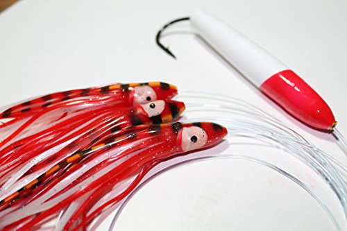 This 4-inch red/white cedar plug is an age old standby. Just as the natural plug was the first cedar plug, the red/white cedar is second in longevity. This lure is designed to imitate a small bait pod being chased by a predator fish. Rigged on an 8-foot 150 lb mono daisy chain. It includes three 4.75-inch red, black, yellow and white double skirted squids.