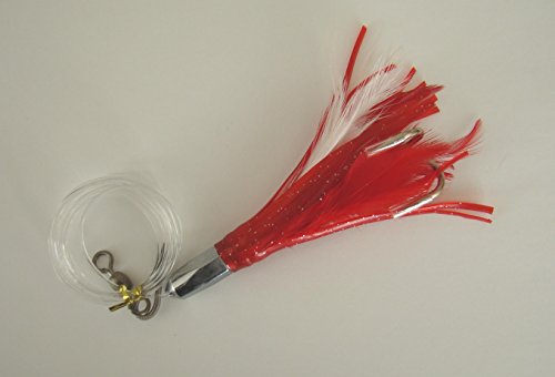 Here are 6 pieces brand new 5" rigged Red/White Mini Bullet Jet Feather. Feathers act as an underskirt and are covered by a vinyl outer skirt with eyes. The jet-head leaves a tantalizing bubble trail, making it easier for gamefish to track. These little jet heads have saved the day on many an offshore angler's fishing trip, especially when game fish are picky about the type and size of lure they'll strike. These economical jets can be rigged in a daisy chain, predator/prey rig, spreader rig or trolled alone, making them an extremely versatile lure.