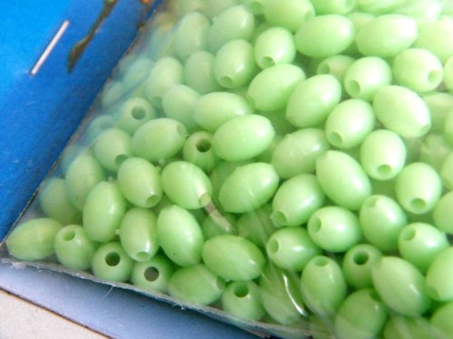 Glow in the dark green hard plastic egg shaped beads, can be use on lures, hooks or on your line just above the hook for added attraction while night fishing or deep water fishing. Features a hole in the center for fishing line to thread through. Helpful fishing tackle, will bring more convenience to anglers.