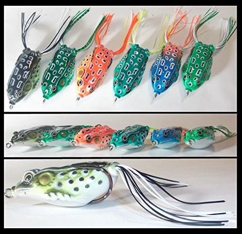 Six Soft top water Frogs, All different color variations These top water frog lures are soft and hollow rubber. Life-like swimming action in the water. They have a duel hidden hook making them almost snag resistant so you can cast them right into those weed beds to pull out the "big one" They work well for slow retrieval or in the shallows. Game fish find them irresistible
