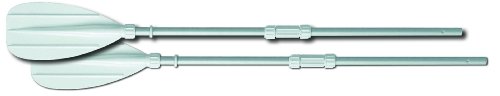 These inexpensive oars are designed for use with AIRHEAD and other inflatable boats. The 2 section aluminum shafts are durable and lightweight. The 15 in. high impact plastic blades and grips are designed for maximum rowing efficiency and comfort. Length: 53 in., 1 pair per package.