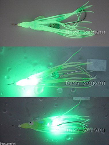 1X 5" 21g Fishing Saltwater Lures LED Flash Glow Octopus Skirts Soft Plastic lure This lure comes with a built in LED Flash light,Which is a Water Activated Deep Drop Fishing Flashing ,Light If you never use it, try it, you will find there will be more fun when you go fishing. Flash Modes: automatically flash when drop it into the water and the light goes out when out of water Rated depth: 200 meters Burn time: Approx. 60 hours Size: 5" Hook Size: 4/0 Weight:21g Leader Line:36Cm,100Lbs Quantity: 1 pcs The color is random delivery