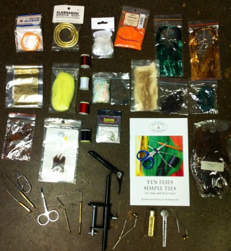 A superb beginner fly tying kit with all the tools you need to get started. In addition, we have added a nice mixture of assorted materials, tying thread, hooks, and beads to make this a perfect holiday gift tying kit. Great for kids and adults. Kit comes with too much to list, including: Deluxe c-clamp fly tying vise, 2 bobbins, 2 whip finishers, hackle pliers, bobbin threader, bodkin, material scissors, hair stacker, 4 spools of thread, mixture of feathers, fur, mylar, synthetics, more!! Kit also comes with a Concise Beginner Fly Tying Book SPECIAL FREE BONUS - Zippered Soft Case A $19.99 value!