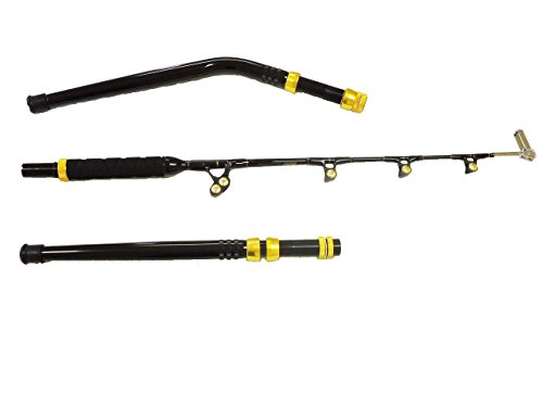 Blue Marlin Tournament Edition 3pc 160-200lb Deep Drop Trolling Rod (Swing tip) This rod features a 3.5ft rod blank complete with straight and long bend handle. 4 roller guides plus one swing tip. This is our finest grade tournament rod and ideal for Marlin, Yellowfin Tuna, and record Wahoo in the Bahamas. Constructed with the most expensive composite blank and wide mouth roller guides capable of passing the largest wind on leaders for outstanding control at boat side! All guides feature the finest components and have double wraps for strength. The span wrap construction is important when a fish takes off to the side and the rod will resist twist better than any rod we have tested. Ideal with our 80 wide Blue Marlin Tournament Edition Reel Made from the finest High Carbon Composite blank Span Wrap construction to minimize side loads and twist Wide mouth wind on roller guides EVA foam grip for non slip and comfort Stainless steel swing tip Total rod length is 5'5" Virtually unbreakable