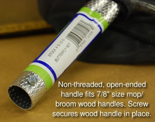 The Butterfly net is made of1/2" plain aluminum tubing on a 15" diameter hoop. It has a 1" diamond-embossed aluminum handle 6" long which you can easily attach a 7/8" unvarnished handle, up to 60" long, available in most hardware stores. The Net is 1/16" mesh - 22" deep. If you'd like a net with a 24" or 30" wooden handle, you can order them on our website: http://www.douglasnets.com/product.php?productid=23