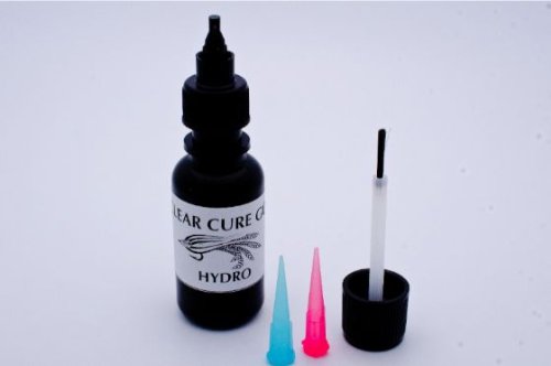Clear Cure Goo Hydro - tack free! The Hydro Clear Cure Goo is the most suitable tack free material on the market- It is by far the thinest material we have ever made. It has the consistency of a watery head cement. It cures in just 5 seconds, it can be used as a top coat for any of the Clear Cure goo materials, you can use it to cover any and all freshwater flies. It not only gives durability to delicate flies but gives it a lifelike translucency . You can use instead of using head cement or lacquer to finish off all your flies.For the Saltwater tier, you can use the Hyrdo to stiffen materials similar to what the Clear Cure Goo Brushable can to. This material is much more thin than the Brushable. You may apply it to popper heads, use it as a top coat on other Clear Cure Goo materials. You can apply a little at a time- curing as you to make a fly solely out of the Hydro material and as it is a Tack Free Product- you will not need to use a head cement, or lacquer. You wont even need to use any alcohol on it to get your tack free results. 15ml bottle Applicator top Brush top Fine and extra fine applicator tip Curing time 5-10 seconds