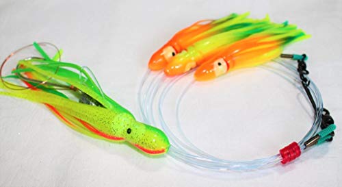 - **NEW DETACHABLE DAISY CHAIN FOR FAST CHANGEOUT** 8-foot daisy chain w/ 150lb test leader, three green/orange/yellow 4.5-inch double-skirted squids