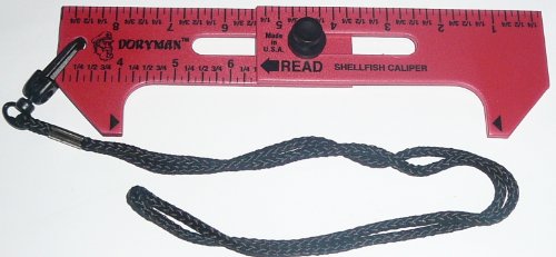 Doryman Shellfish Calipers can be set from 3 to 6 1/2 inches to measure lobsters and crabs to specific legal sizes. While they float, these calipers also employ an attached lanyard to avoid any dropping mistakes. When the caliper is fully extended it becomes a 9 inch straight edge rule. When collapsed it can easily fit into a pocket. An easy twist knob regulates the calipers size and can be used to lock in measurements. These calipers have four color options: Blue, Green, Red, and Yellow.