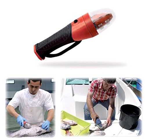 Portable professional fish scaler, composed by handle, two transparent covers, blade head, and adaptor. The soft-rubber injection handle works comfortable and anti-slip.