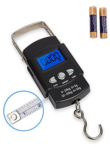 Fishing Scale, Hanging Scale, Rockjame Backlit LCD Screen 110lb/50kg Portable Electronic Digital Postal Hook Luggage Shopping Spring Scale with Measuring Tape, 2 AAA Batteries Included