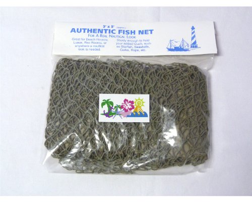 Genuine Fish Net. Grey/Tan. Approximately 3 X 10'. Comes packaged with a Tropical Magnet with starfish, anchor, palm tree and sailboat. Great for beach houses, luaus, recreation rooms or anywhere a nautical look is needed. Sturdy enough to hold your added touch, such as starfish, seashells, corks, rope, etc.