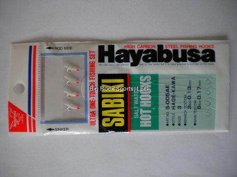 Hayabusa S-005AE-3 Hage Kawa Sabiki Hot Hooks are multiple hook arrangements that are ideal for making bait quickly and effectively. Available in quantities of 6, 4, and 2.