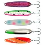 The Huntington 1/2EGR-MGFS Drone Spoon, 2.75-Inch, Electric Green, Mirror Gold Flash Scale. The Drone Spoon is made of solid, highly polished stainless steel that is unaffected by water conditions anywhere in the world. There is no plating to corrode, chip or peel. Replaceable hooks are of the highest quality forged Mustad O'Shaughnessy pattern, with filed hollow points and Duratin plated. The solid nickel silver rings are hand silver soldered for greatest strength.