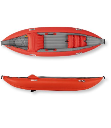 Innova Twist Inflatable Kayak - The Twist Inflatable Kayak by Innova is the boat you have been dreaming of for day touring, backpacking into hidden lakes, or fishing your favorite mountain river. The lightest, greenest, general recreation kayak on the market at only 16 pounds, the Twist comes in a nylon bag no larger than a sleeping bag stuff sack and easily backpackable. Made of LitePack fabric, this kayak is made from rip-stop polyester fabric with a coating of natural rubbers on the interior for great air retention. The Twist is green because it does not use PVC in its fabric like the majority of competing inflatables, and the world is slightly better for it. High-quality bayonet-style valves are used in three separate main chambers making it so the kayak can be paddled to shore in the unlikely event that any one of its chambers loses air. A substantial, removable tracking fin is included, and gear bungees are installed behind the seat. When you are ready to hike to your favorite hidden watering hole, don't forget to pack your Twist Inflatable Kayak by Innova.