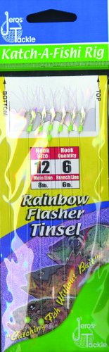 The JT RFT-6 Rainbow Flash Tinsel Sabiki, Size 6. Snelled on a quality nylon leader with dropper loops, swivel and snap. These hooks are dressed with Mylar "skin" and tinsel hair, secured with fish attracting vinyl. Ready to fish packaging makes fishing a snap. Open the top of the package, secure the swivel to your line and gently pull the rig out of the package. No tangles.