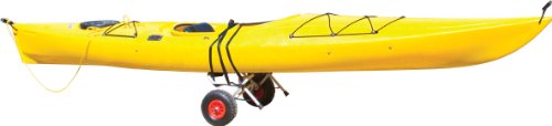 The KC-Dolly easily transports a single kayak or canoe from vehicle to water. The boat is held in a V-shaped cradle with foam bumpers on each arm and is secured in place with a tie-down strap. Large pneumatic tires provide stable support on uneven terrain. A spring-loaded stand keeps the dolly upright on shore for fast loading out of the water. Folded Dimensions: 26 inch wide x 16.5 inch height. Cradle: 15.5 inch W x 13 inch L. Stand: 7.5 inch H. Wheel to Wheel: 26 inch W. Weight: 9 LBS.