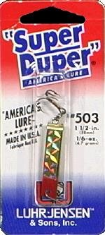In the world of trout fishing, if there ever was an "America's Lure" it may very well be the Super Duper. Its unconventional "U" shaped design catches water and creates a swimming action game fish find irresistible. Equally effective cast or trolled on light line, the Super Duper will take trout, bass and panfish. A deep selection of finishes assures the Super Duper will perform on your local waters. See Tech Report #11: Lake Trolling Thin-Blade Spoons for Trout, Tech Report #5 Lake Trolling Trout Techniques.
