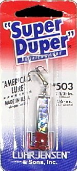 In the world of trout fishing, if there ever was an "America's Lure" it may very well be the Super Duper. Its unconventional "U" shaped design catches water and creates a swimming action game fish find irresistible. Equally effective cast or trolled on light line, the Super Duper will take trout, bass and panfish. A deep selection of finishes assures the Super Duper will perform on your local waters. See Tech Report #11: Lake Trolling Thin-Blade Spoons for Trout, Tech Report #5 Lake Trolling Trout Techniques.