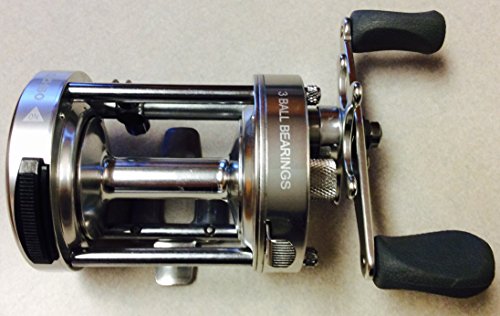 Feature Great reel for Saltwater and Freshwater Fishing and Big Game Fishing Color: Silver 3 Ball Bearing Gear Ratio 4.2:1 One-way Clutch Anti-Reverse Bearing Ridig Chrome - Plated Brass Frame Anodized Aluminum Side Plates Machined Aluminum Spool Anodized Gold Smooth Main Gear Applied Star Drag System Selective On/Off Bait Clicker Dual Centrifugal and Mechanical Brake System Line Capacities 180 yards of 14lb line 250 yards of 16lb line 210 yards of 20lb line 250 meters of .40mm line 320 meters of .35mm line Size and Weight 16 ounces Reel Body: 3 1/2 Wide Reel Diameter: ~3 Inches