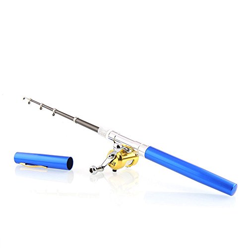 New Blue Mini Portable Pen Shape Aluminum Alloy Fish Fishing Rod Pole+Reel Combos Features: * Fishing anytime, anywhere with this world smallest fishing rod ! * It is Portable, Compact, Lightweighted and easy to use. * Fits Pocket, Glove Box, Briefcase, Backpack. * Suitable for fishing from a boat, a dam or on ice. * Perfect gift for the avid fisherman, executive kid on the go ! Specification: Pen Fishing Rod - Material: Fibre Glass, aluminium alloy - Closed Length: 8 inch(21cm) - Extended Length: 39 inch(97cm) - Dia: 0.6 inch(15mm) - Weight:60g Mini Baitcasting Gold Reel? - Material: aluminium alloy brass - Color: Blue - Length of the body: 4.2cm (approx) - Dia: 2.7cm (approx) - Weight:70g Reel Installation Instructions: - open your pen rod by taking off the cap - simply insert the reel between the two grooves on the pen (there is a moving piece which slides up and down) - twist the screw down to tighten the reel onto the rod. Package Includes: 1x Pc. Blue pen fishing rod 1x Pc. Fishing reel