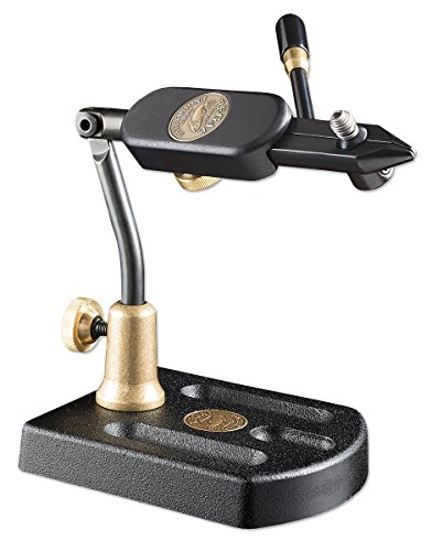 This fly tying vise weighs under two pounds thanks to a new lightweight aluminum base and a new offset design that takes up half the space of the conventional vise. Same great reliability, rock-solid stability, performance, and great rotating and swiveling Regal jaws that fit size 22-1/0 hooks. Three pockets on the base for hooks and beads. Made in USA.