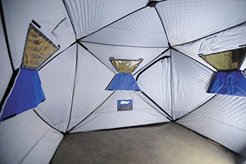The otter outdoors xth hub shelters feature a patent pending otter thermal-tec 600 denier fabric layering system (light blocking/wind stopping otter shell with a quilted thermal inner shell). the Triple layer shell provides the perfect combination of durability, warmth, and reduced condensation. The shelter has Xtreme duty 11 mm poles, reinforced corners, and a wide base for maximum fishing area. Features front and rear dual coil zippered entry doors, removable TPU crack-resistant windows with insulated covers, interior cargo pockets, and exterior tie-down rope pockets. Includes a deluxe, oversized carry bag with poly sleeve for ease of packing and added protection. Plenty of room for 4 or 5 anglers. Setup: 76 H x 103 W (hub-to-hub), bottom: 95 x 95 , collapsed: 66.92 L x 11.22 W x 11.22 H, weight: 41 lbs, number of sides: 4.