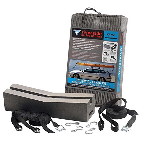 The Riverside Universal cartop kayak carrier kit offers a durable and easily portable option for getting your kayak to the water. The extra-tall, mini-cell foam blocks have a non-skid laminate and a universal cut-out that enables them to mount directly to factory roof racks. The kit includes 2 blocks, 1 utility strap, 2 bow and stern tie-down straps, 2 block straps, 4 bumper hooks, instructions, and mesh bag.