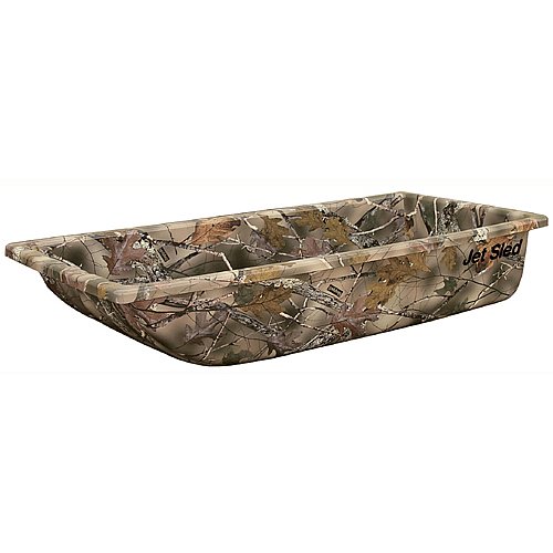 The rugged polyethylene Jet Sled from Shappell is designed with molded runners for strength and stability. Optional hitches allow towing by an ATV or snowmobile.