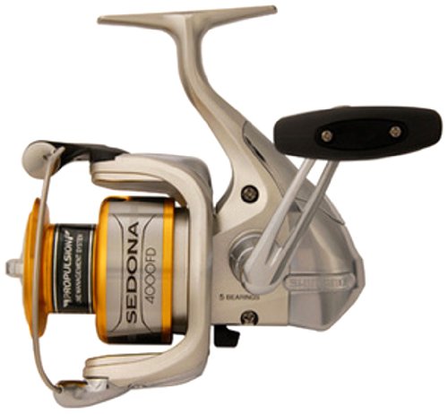 Shimano Sedona FD Spinning Reel puts you in control! SAVE BIG! LONG, silky casts, effortless retrieves, and enough "moxy" to haul 'em in! It's what you get with the Shimano Sedona line... top-of-the-line features and high-quality, long-lasting construction, at a price that's tough to top! Available in a variety of sizes, from perch to walleye! What it's all about: Propulsion line management system for long casts; Four shielded stainless steel ball bearings + anti-reverse bearing; Dyna-balanced rotors eliminate wobble; Fluidrive II precision cut / wrapped gear system provides a smooth, powerful retrieve; Cold-forged aluminum spool. State Model. Model No. SE500FD; Ball Bearings: 4+1; Reel Ratio: 4.7:1; Line/Cap. (lbs./yds.): 2/190, 4/100. Model No. SE1000FD; Ball Bearings: 4+1; Reel Ratio: 6.2:1; Line/Cap. (lbs./yds.): 2/270, 4/140. Model No. SE2500FD; Ball Bearings: 4+1; Reel Ratio: 6.2:1; Line/Cap. (lbs./yds.): 6/200, 8/140. Model No. SE4000FD; Ball Bearings: 4+1; Reel Ratio: 5.7:1; Line/Cap. (lbs./yds.): 8/240, 10/200. Order Yours Today! Shimano Sedona FD Spinning Reel