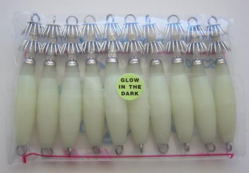 Here are 30 pieces of glow in the dark plastic body Squid Jigs with a swivel style hook assembly. The size of the Squid Jig is 3-3/4 inches in length. We offer free shipping,