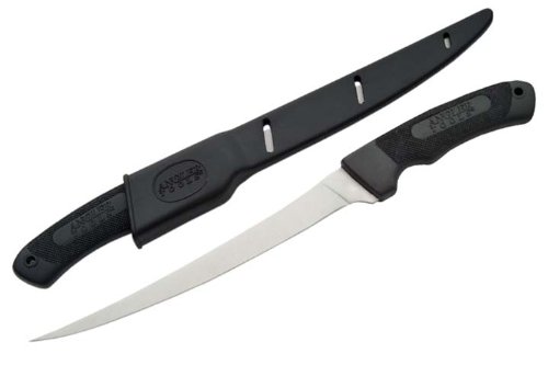 This Long Fish Fillet Knife by Angler Tools is 14 Inch in overall length. The blade is made of stainless steel and the handle is knurled black rubber for a safer grip. This knife comes with a hard plastic sheath and a belt clip for fastening.