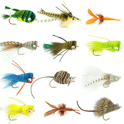 The Fly Fishing Place Bass Bug Collection – Set of 12 Bass Fly Fishing Flies – Surface Poppers Divers and Subsurface – Hook Sizes 2,4 and 6