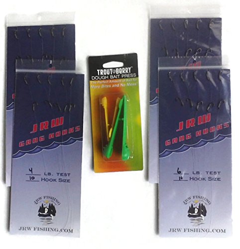 The JRW Trout Sampler includes: -2 packages of #10 gang hooks tied on 4 pound test fishing line -2 packages of #10 gang hooks tied on 6 pound test fishing line - 1 Powerbait press combo - which includes 1 each Troutberry dough bait press and 1 each eggberry dough bait press