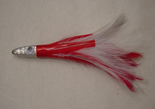 Here are 6 pieces brand new 6" Red/White Tuna Feathers.