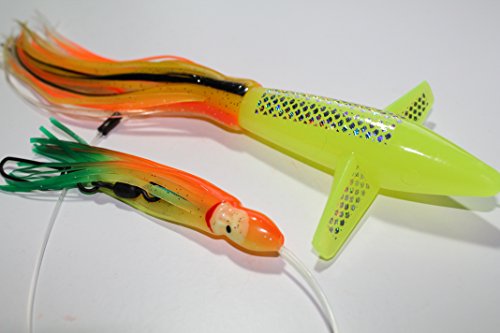 This bird has holographic strips on both wings and its belly that creates a lot of flash mimicking the effect of predators attacking a bait pod. A 4-inch, green and yellow teaser squid covers the snap swivel and adds to this lure's presentation.