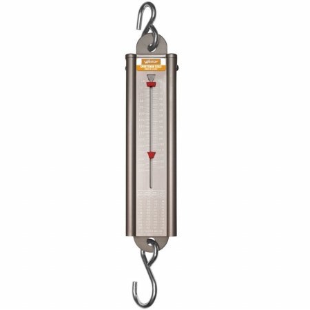 Hanging style sportsman scale that features a 300 lb. capacity in 5 lb increments, oversize pointer, anodized body and heavy gauge zinc plated steel S hooks.