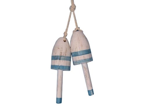 Classically themed and delightfully decorative, our Wooden Vintage Light Blue Maine Lobster Trap Buoy 7 inch is sold in a set of two. This whitewash and blue wooden float is the perfect beach decor accent to your home or collection. Traditionally lobstermen would hand paint their own unique buoy to distinguish theirs amongst the many lobster trap buoys at sea. In upholding the spirit of the lobster buoy tradition, we offer a new or rustic finish, sizes of 7", 8", 15" and 20" and finally a range of colors such as: dark blue, orange, red, dark red, green, dark green, light blue, and yellow.NOTE: For decoration only, this is not an authentic buoy/float. Wall mounting hardware not included. Handcrafted from wood by our master artisans Sold in a set of two with rope to easily mount on a wall Each buoy is unique - all buoys are hand painted so no two are alike and not exactly as pictured Rustic whitewash buoy accompanied by light blue stripes create a classic nautical look