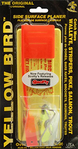 The original yellow bird side surface planer! now featuring working tattle flag! attached to your line, these planers will carry Baits and lures 150 feet or more off the side of a moving boat or River with sufficient current. Your catch will improve because fish will no longer be disturbed by your boat going directly over them before the lure passes by. They are ideal for both freshwater and saltwater and have an automatic trip for sporting play of fish. Single Port side planer board with working tattle flag & hardware.