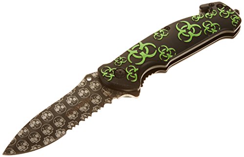 Everyone in the zombie apocalypse will want to have a hidden weapon if the fight ever gets within reach and with Green Skull Fold Out Knife that is just what you will have. This spring assist knife will fit perfectly away from view and when the fighting gets close you can slip it out and turn the tables. Constructed with a grey stainless steel blade with skulls graphic and aluminum handle with biohazard graphics, this is a tough and tough looking knife. For your own secret weapon make sure you grab the Green Skull Fold Out Knife.